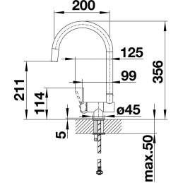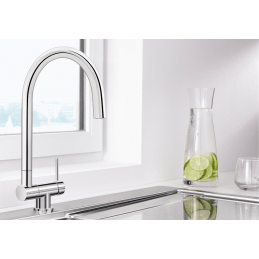 • Optimálna inštalačná výška – výtok vody padá priamo do stredu drezu pre maximálnu efektivitu.