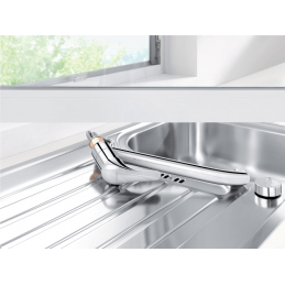 Blanco Daras-F je praktická a cenovo dostupná kuchynská batéria určená na montáž pred okno. Vďaka sklopnému mechanizmu ponúka jednoduché a rýchle ovládanie – batériu stačí kolmo nadvihnúť a položiť nabok, aby nič nebránilo otvoreniu okna. Je ideálnou voľbou pre kuchyne, kde je drez umiestnený pod okenným parapetom.