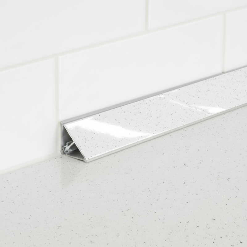 Luxusná a elegantná tesniaca lišta KRONOSPAN v dekore Andromeda Biela lesklá (K217 GG) je určená na precízne a profesionálne zakončenie pracovných dosiek. Lišta spoľahlivo utesňuje spoj medzi pracovnou doskou a stenou, čím účinne zabraňuje prenikaniu vody a nečistôt, a zároveň dodáva kuchyni moderný, čistý a žiarivý vzhľad bieleho mramoru s jemnými trblietkami a vysokým leskom.