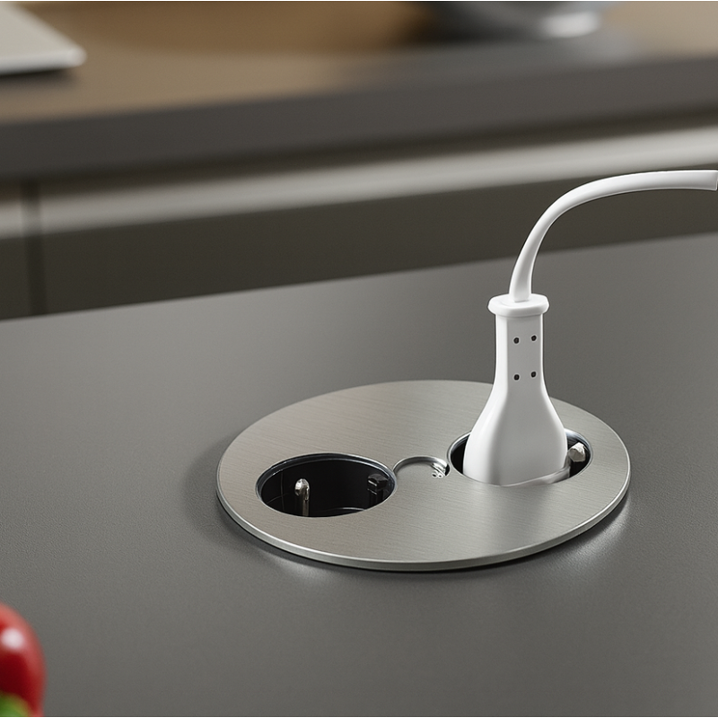 Elektrická zásuvka TWISTER je moderné a priestorovo úsporné riešenie pre kuchynské linky, kancelárske stoly či pracovné plochy. Vďaka svojej veľmi nízkej montážnej hĺbke ju možno jednoducho integrovať aj nad zásuvky, ktorým vôbec neprekáža.
