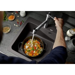 Blanco Naya 5 je praktický granitový kuchynský drez, navrhnutý pre efektívne využitie priestoru v menších až stredne veľkých kuchyniach. Vďaka požiadavke na minimálnu šírku skrinky 50 cm a absencii odkvapovej plochy ponúka maximálnu pracovnú plochu na linke pri zachovaní komfortnej veľkosti vaničky.