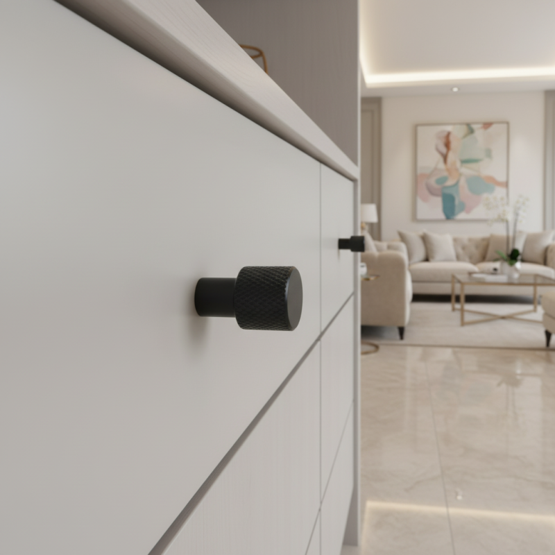 Industriálna úchytka INDUST I. v elegantnom čiernom matnom prevedení je dokonalým doplnkom pre moderné, loftové a minimalistické interiéry. Charakteristická ryhovaná (knurled) textúra dodáva úchytke originálny technický vzhľad a zároveň zlepšuje úchop pri otváraní dvierok či zásuviek.