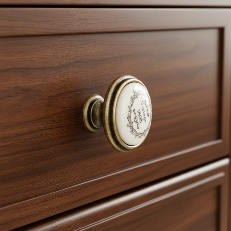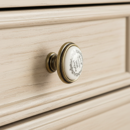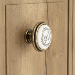 Porcelánová knopka FRIDA v starozlatom prevedení je krásnym a nadčasovým doplnkom, ktorý dodá vášmu nábytku noblesný vintage charakter. Kombinuje kvalitný porcelán s elegantným dekorom Vintage 1898 a kovové telo v starozlatej patine, čo spolu vytvára štýlový prvok vhodný do klasických aj vidieckych interiérov.
