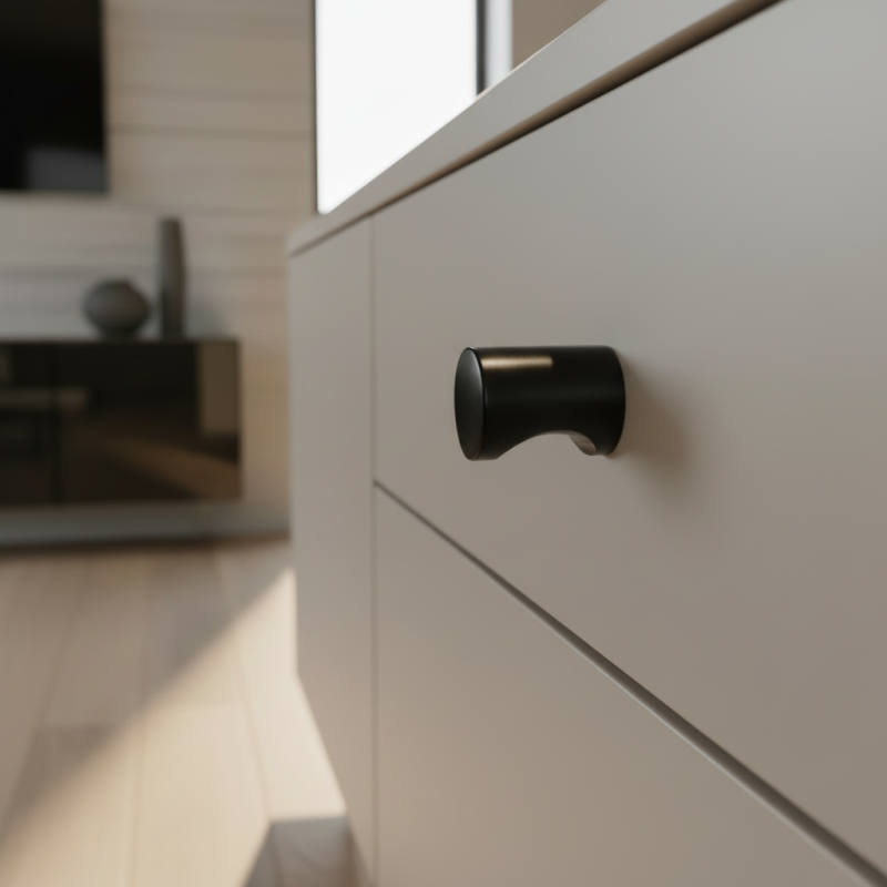 Knopka LIVIA v povrchovej úprave čierna matná je štýlovým a funkčným riešením pre moderné interiéry. Jej kompaktný valcovitý tvar doplnený o praktické bočné vybratie zabezpečuje pohodlné uchopenie, takže manipulácia s dvierkami či zásuvkami je maximálne komfortná.