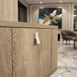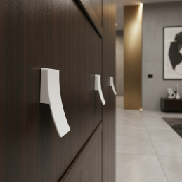 Matná biela povrchová úprava pôsobí elegantne a neutrálne, vďaka čomu sa ľahko kombinuje s rôznymi materiálmi ako drevo, laminát či lakované povrchy. Úchytka má kompaktné rozmery a príjemný úchop, čo zaručuje pohodlné každodenné používanie.