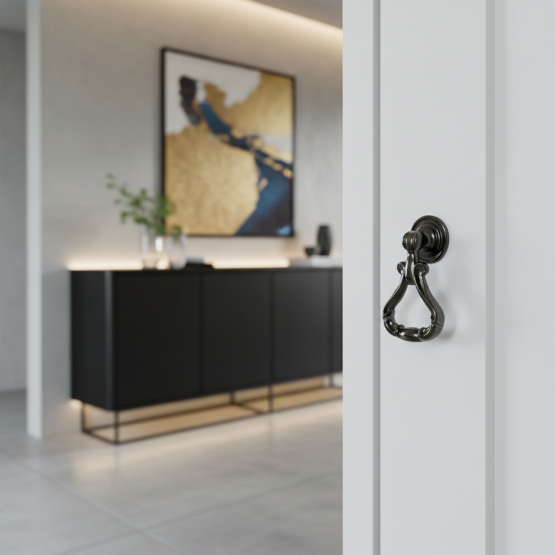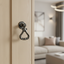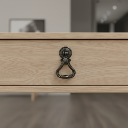 Štýlová rustikálna úchytka typu knopka CORTINA v čiernom lesklom prevedení je výrazným dizajnovým prvkom pre klasický, vintage alebo rustikálny nábytok. Elegantný tvar s pohyblivým spodným úchopom dodáva nábytku jedinečný charakter a dekoratívny vzhľad.