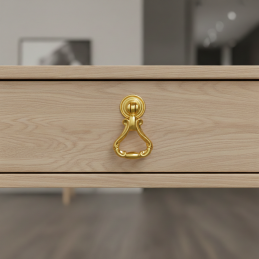 Elegantná rustikálna úchytka typu knopka CORTINA v zlatom lesklom prevedení je výrazným dekoratívnym doplnkom pre klasický a vintage nábytok. Bohato tvarovaný dizajn s pohyblivým spodným úchopom dodáva nábytku luxusný vzhľad a zvýrazňuje jeho štýl.