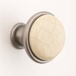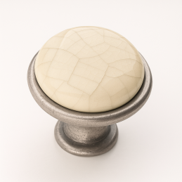 Porcelánová knopka TOSCANA predstavuje dokonalé spojenie kovovej základne v úprave nikel patina a porcelánového vrchného dielu s efektom popraskaného porcelánu, ktorý vytvára jedinečný vintage vzhľad. Tento detail dodáva nábytku originálny charakter a osobitosť.