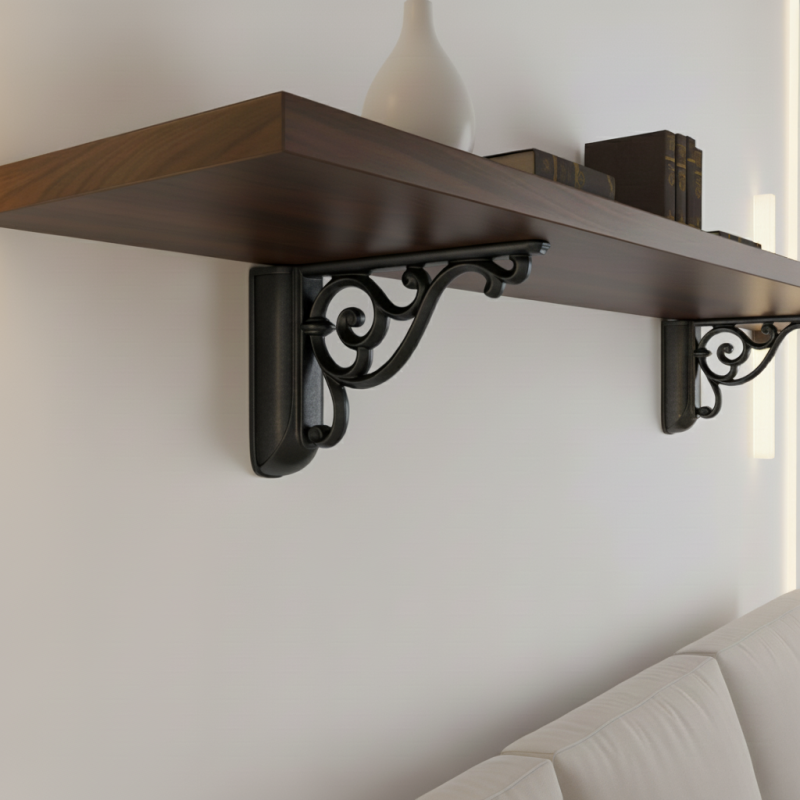Štýlový rustikálny držiak poličky v elegantnom staročiernom prevedení, ktorý dodá vášmu interiéru jedinečný vintage charakter. Dekoratívne tvarovaný dizajn v sebe spája robustnosť a estetiku, vďaka čomu je ideálny pre kuchyne, obývačky, predsiene či chalupársky štýl bývania.