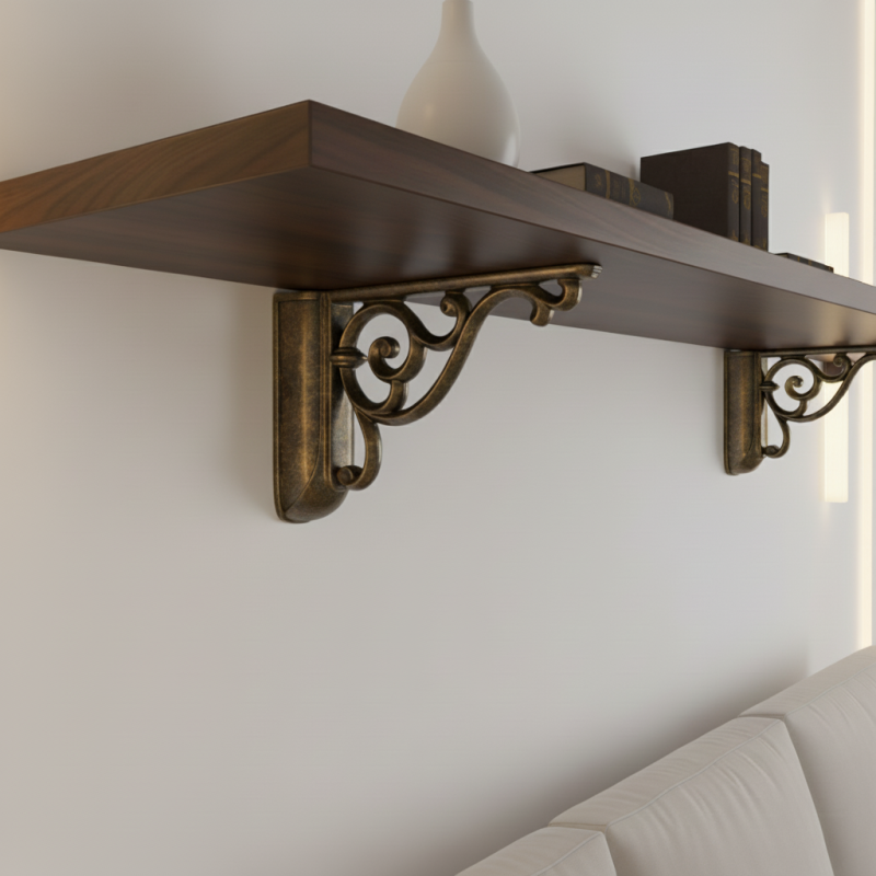 Elegantný rustikálny držiak poličky v luxusnom staromosadznom prevedení, ktorý dodá interiéru tradičný, remeselný a dekoratívny charakter. Vďaka pevnej kovovej konštrukcii je ideálny do kuchyne, obývačky, predsiene či chalupárskeho štýlu bývania.