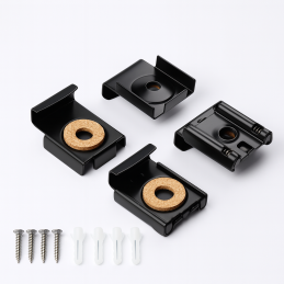 Set obsahuje všetko potrebné na inštaláciu – 2x spodný úchyt, 2x horný úchyt s pružinou, hmoždinky a skrutky. Montáž je rýchla a jednoduchá: najprv sa uchytia spodné úchyty, následne sa vloží sklo a upevní horná časť pomocou pružín.