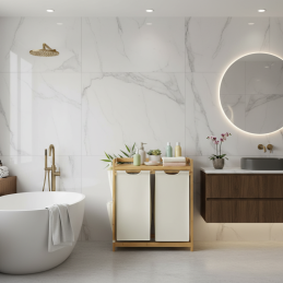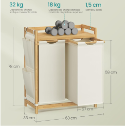 Elegantný a praktický kôš na bielizeň SPA HARMONY DUO kombinuje prírodný bambusový rám s jemnými textilnými vakmi v bielej farbe. Vďaka dvojitému prevedeniu umožňuje jednoduché triedenie bielizne už počas odkladania.