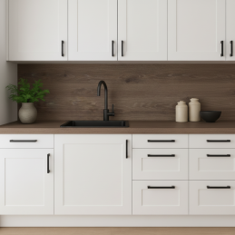 Dodajte svojej kuchyni praktickú ochranu a elegantný vzhľad s našou kuchynskou zástenou vyrobenou z kvalitnej drevotriesky potiahnutej odolným laminátom. Tento materiál sa vyznačuje vysokou odolnosťou voči poškodeniu, mechanickej záťaži a zvýšeným teplotám, čo zaručuje dlhú životnosť aj pri každodennom používaní.