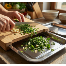 Praktická a dizajnová bambusová doska na krájanie s integrovanými nerezovými nádobami je ideálnym pomocníkom do modernej kuchyne. Premyslená konštrukcia umožňuje pohodlnú prípravu surovín bez neporiadku – nakrájané potraviny jednoducho zosuniete priamo do vyberateľných nádob.