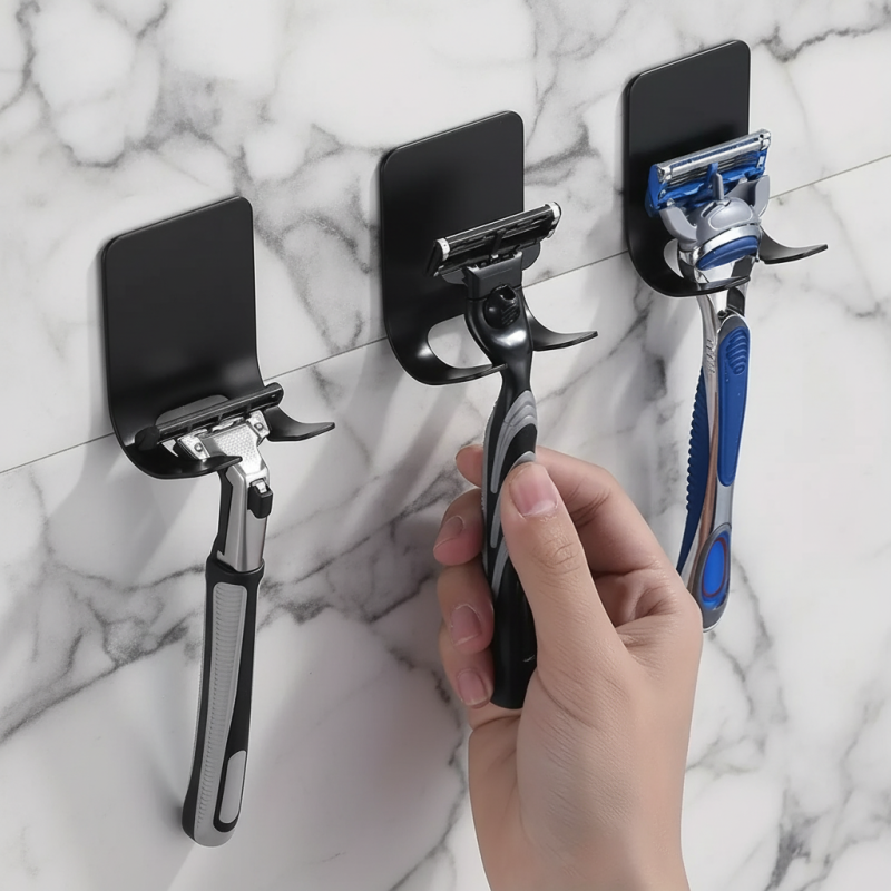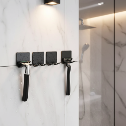 Praktický nalepovací vešiak na žiletky v elegantnej čiernej farbe je ideálnym doplnkom do každej kúpeľne. Vďaka minimalistickému dizajnu a kompaktným rozmerom poskytuje nenápadné, hygienické a bezpečné miesto na odkladanie holiaceho strojčeka.