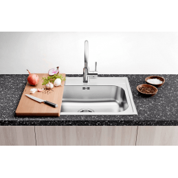 Blanco Dana 45 je moderný jednovaničkový nerezový drez, určený na montáž na pracovnú dosku. Vďaka svojim kompaktným rozmerom 480 × 500 mm je ideálny pre menšie kuchyne alebo kuchynské zostavy so skrinkou od 45 cm, bez toho, aby ste museli robiť kompromisy v kvalite či estetike.