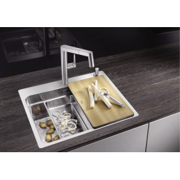 Blanco Etagon 500-IF/A je prémiový nerezový drez, ktorý prináša úplne nový rozmer práce v kuchyni. Kombinuje veľkú, kapacitnú vaničku s inovatívnym riešením ETAGON – univerzálnym koľajnicovým systémom, ktorý vytvára tretiu pracovnú úroveň a výrazne rozširuje možnosti drezu.