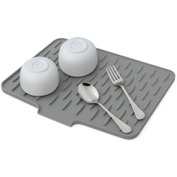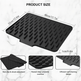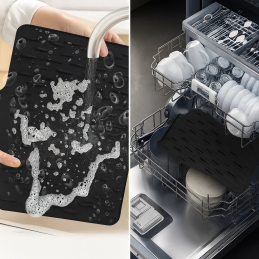 S kompaktnými rozmermi 400 × 320 mm a výškou len 10 mm sa ľahko zmestí na akúkoľvek pracovnú plochu a je ideálny na taniere, poháre, príbory či kuchynské náradie. Po použití ho jednoducho umyjete v umývačke riadu.