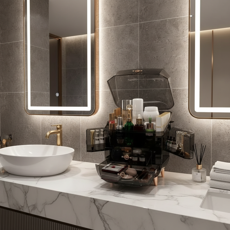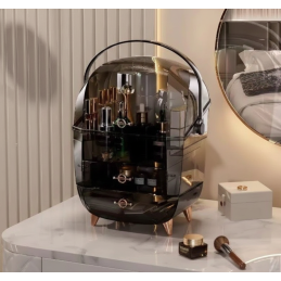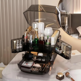 Organizér je vybavený priestrannými zásuvkami a veľkým horným úložným priestorom s priehľadným krytom, ktorý umožňuje okamžitý prehľad o uložených produktoch. Bez problémov pojme parfumy, krémy, balzamy, make-up aj starostlivosť o pleť. Transparentné veko chráni obsah pred prachom a zároveň uľahčuje rýchly výber potrebných vecí.