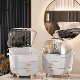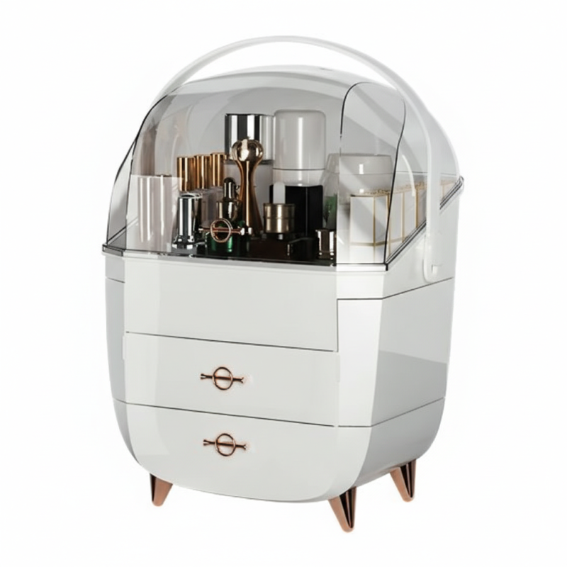 Organizér ponúka veľkú úložnú kapacitu vďaka priestranným zásuvkám a veľkému hornému úložnému priestoru s priehľadným ochranným krytom, ktorý chráni kozmetiku pred prachom a zároveň umožňuje rýchly a jednoduchý prehľad o uložených produktoch. Bez problémov pojme parfumy, krémy, balzamy, make-up aj starostlivosť o pleť.