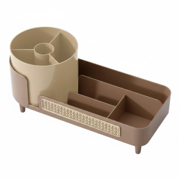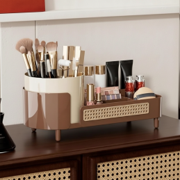 Elegantný a praktický otočný organizér MAKEUP v modernom hnedom prevedení je ideálnym riešením na prehľadné uloženie kozmetiky, štetcov a každodenných beauty doplnkov. Vďaka svojmu nadčasovému dizajnu s jemne drážkovanými stenami pôsobí štýlovo a zároveň slúži ako dekoratívny prvok interiéru.