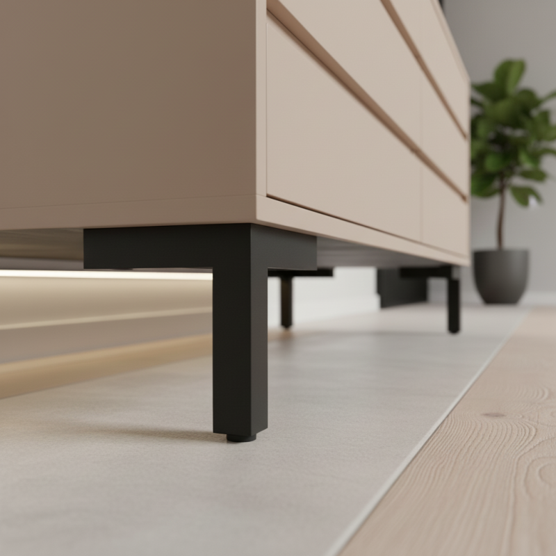 Moderná nábytková nožička ANGEL v povrchovej úprave čierna matná je ideálnym riešením pre komody, skrinky, nočné stolíky či iný nábytok, ktorému chcete dodať stabilný a estetický základ.