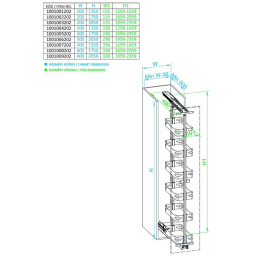 Stojan je navrhnutý tak, aby sa prispôsobil rôznym šírkam korpusu – 200 mm, 300 mm alebo 400 mm. Vďaka tomu efektívne využijete aj tie najmenšie a často zanedbané priestory vo vašej kuchyni. Už žiadne stratené potraviny či neprehľadné zásuvky – všetko bude mať svoje miesto a bude na dosah ruky.