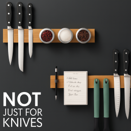 Magnetický držiak na nože z kvalitnej nerezovej ocele a prírodného dreva vo farbe dub prírodný je praktickým riešením pre každú kuchyňu. Vďaka extra silnému magnetu bezpečne udrží vaše nože, nožnice a ďalšie kovové kuchynské náčinie vždy po ruke.