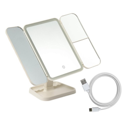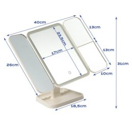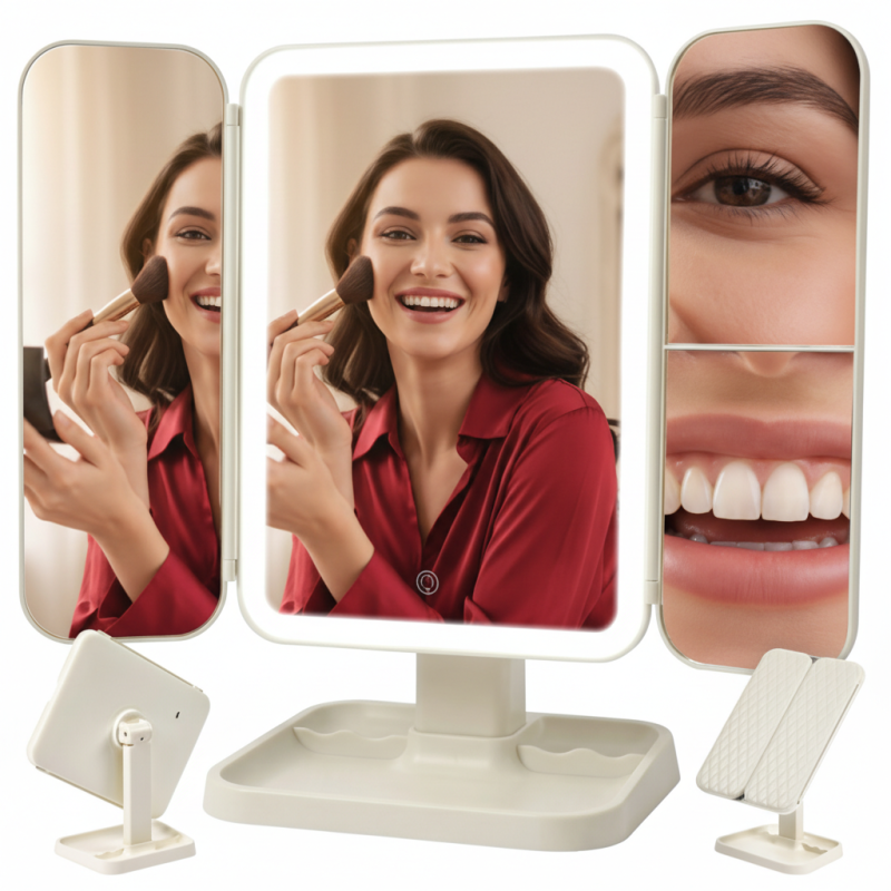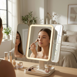 Elegantné kozmetické zrkadlo TREND s LED osvetlením premení váš toaletný stolík na malé domáce kozmetické štúdio. Trojdielne rozkladacie vyhotovenie s centrálnym zrkadlom a bočnými krídlami umožňuje pohodlné líčenie, úpravu pleti aj účesu z viacerých uhlov. Praktický integrovaný organizér poskytuje miesto na uloženie kozmetiky a drobných doplnkov.