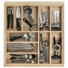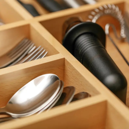 Vďaka nastaviteľnej konštrukcii sa príborník dokonale prispôsobí rozmeru vašej zásuvky a zabezpečí prehľadné uloženie príborov, kuchynských nástrojov či drobných pomôcok. Nadčasový bukový dizajn sa hodí do moderných aj klasických kuchýň.