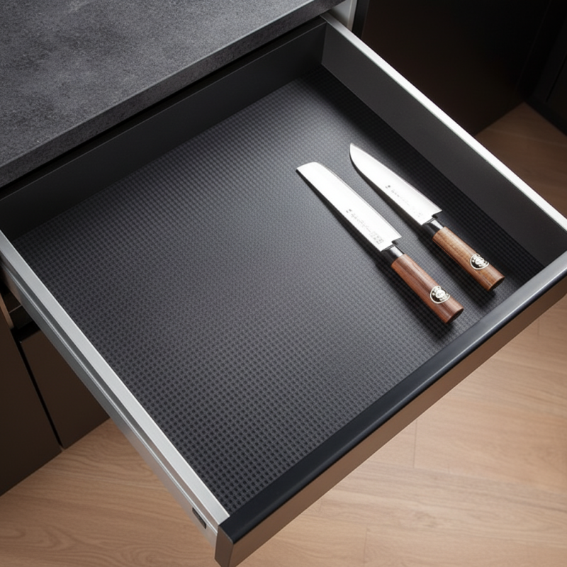 Elegantná čierna protišmyková podložka je praktickým a estetickým doplnkom do zásuviek systému GLOBE LEGRABOX. Vďaka kvalitnému materiálu chráni dno zásuvky pred poškodením, tlmí hluk pri ukladaní predmetov a zabraňuje ich kĺzaniu pri otváraní a zatváraní. Čierne prevedenie pôsobí moderne a luxusne, ideálne pre tmavé aj kontrastné interiéry.
