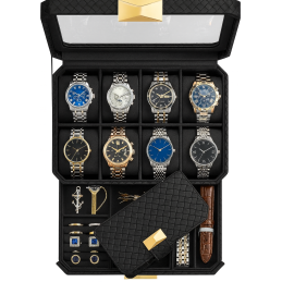Horná vrstva: 8 priehradiek na hodinky všetkých veľkostí, ktoré sú bezpečne uložené a zároveň vystavené cez sklenené veko.