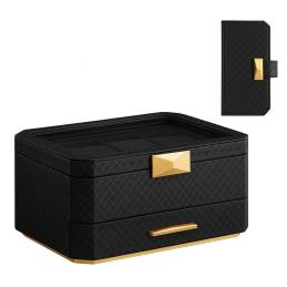 Dizajnová šperkovnica BUGATI WATCH z kolekcie BUGATI je stelesnením elegancie a funkčnosti. Vďaka sofistikovanému dizajnu so skosenými hranami, embosovanej PU koži s tkaným vzorom a zlatým kovaniu inšpirovanému baguette rezom, sa stane nielen praktickým doplnkom, ale aj výrazným štýlovým prvkom.