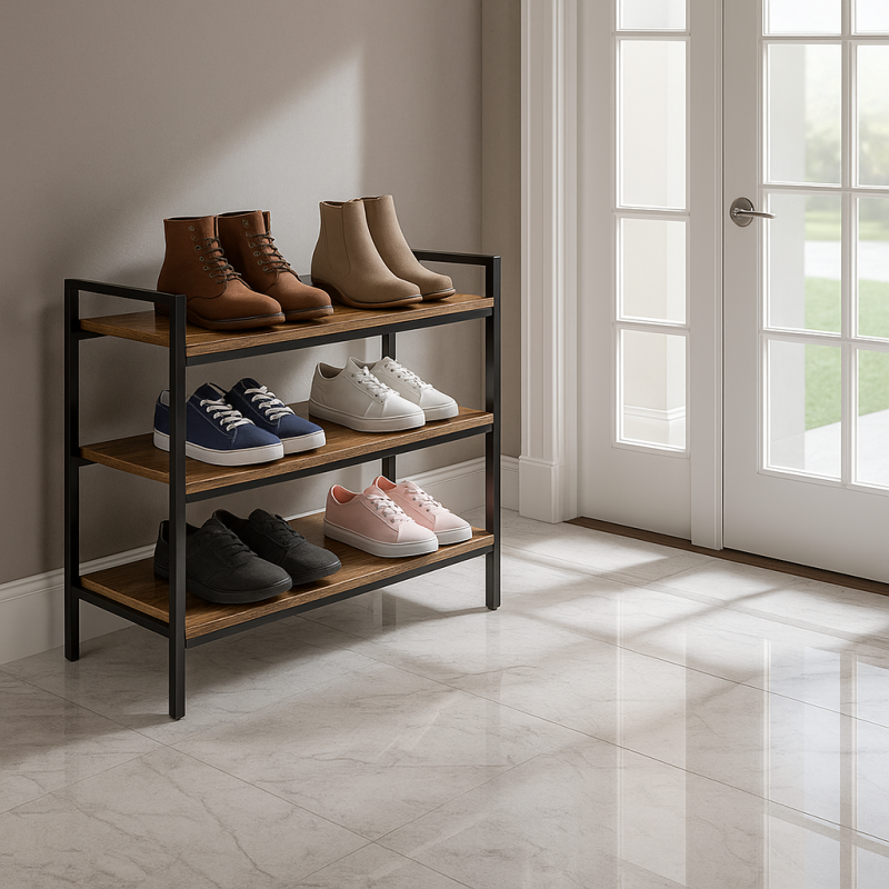 Urobte poriadok s eleganciou! Stojan na topánky MAGNA spája funkčnosť, štýl a odolnosť v jednom dizajnovom kúsku. Kombinácia čierneho kovového rámu a dreva v teplom odtieni vytvára moderný loftový vzhľad, ktorý dodá vašej predsieni, šatníku či kancelárii útulnosť a harmóniu.