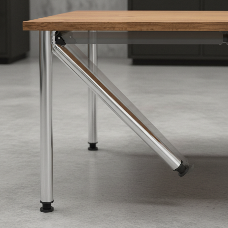 Mechanizmus v hornej časti umožňuje jednoduché zloženie nohy, čím je možné pracovné dosky skryť do skrinky alebo pohodlne zložiť stôl.