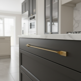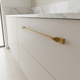 Úchytka VENITA v matnom zlatom prevedení zvýrazní elegantný charakter vášho nábytku. Je dizajnovo výrazná, moderná a pôsobí prémiovo – ideálna pre kuchyne, obývacie zostavy, šatníkové skrine či dizajnové komody.