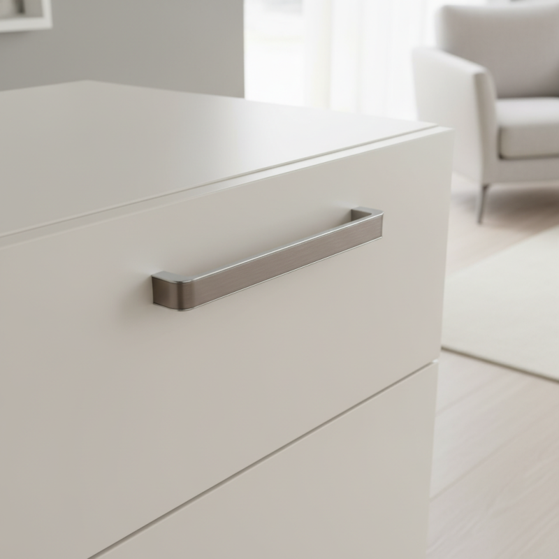 Úchytka je vyrobená z kvalitného kovu s odolnou povrchovou úpravou, ktorá zabezpečuje pevnosť, stabilitu a dlhú životnosť. Hranatý tvar a ergonomický úchop ponúkajú komfort pri každodennom používaní.