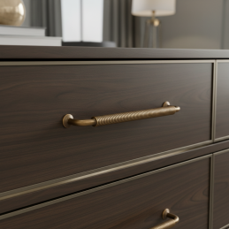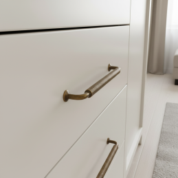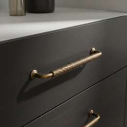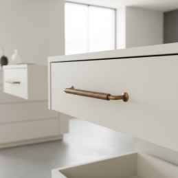Dizajnová nábytková úchytka STIGMA v prevedení mosadz brúsená zaujme výrazným industriálnym vzhľadom a detailne spracovaným vrúbkovaným úchopom. Tento charakteristický dizajn dodáva nábytku originálny a remeselný nádych, vďaka čomu je ideálnou voľbou do loftových, industriálnych aj rustikálnych interiérov.