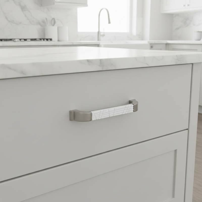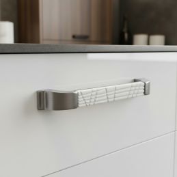 Keramická úchytka BRAGA v povrchovej úprave nikel brúsený prináša modernú eleganciu a nadčasový vzhľad, ktorý sa skvele hodí do súčasných aj klasických interiérov. Kombinácia kovového tela zo zinkovej zliatiny s brúseným niklovým efektom a bieleho porcelánu s dekoratívnym reliéfom vytvára štýlový kontrast a mimoriadne atraktívny dizajnový doplnok.