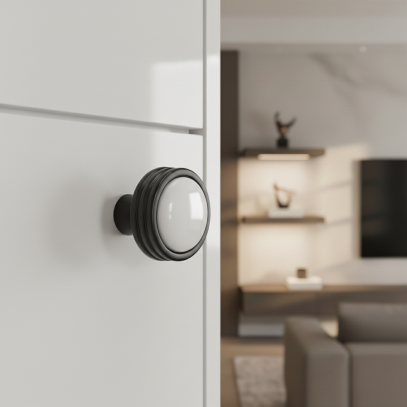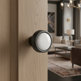 Jemné profilovanie po obvode kovovej časti dodáva knopke dekoratívny charakter, zatiaľ čo porcelánový stred prináša jemnosť a eleganciu. Ideálna je na komody, kuchynské skrinky, kúpeľňový nábytok či dizajnové šuplíky v modernom, industriálnom aj minimalistickom interiéri.