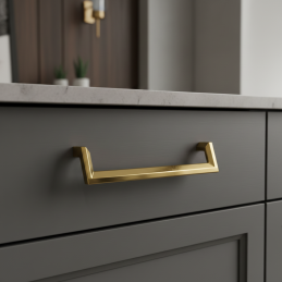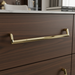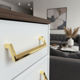 Úchytka AMORA v zlatej lesklej úprave je výrazným a elegantným dizajnovým prvkom, ktorý dodá každému nábytku luxusný a moderný charakter. Jej čisté geometrické línie s jemným zalomením pôsobia nadčasovo, a vďaka vysokému lesku sa úchytka stáva atraktívnou dominantou kuchynských dvierok, komôd, šatníkov či kúpeľňového nábytku.