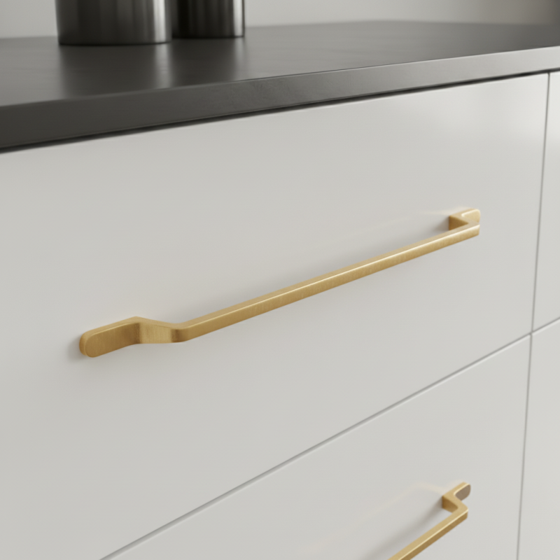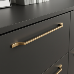 Úchytka ELIDA v zlatej brúsenej úprave je elegantným a moderným doplnkom, ktorý dodá nábytku jemný luxusný akcent. Jej štíhly, dlhý tvar s jemným zalomením na koncoch pôsobí veľmi ľahko a nadčasovo, vďaka čomu sa perfektne hodí do moderných, minimalistických aj elegantných interiérov.