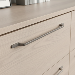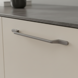 Úchytka ELIDA v povrchovej úprave šedá satin je moderným a elegantným doplnkom pre súčasné interiéry. Jej dlhý, štíhly tvar s jemným zalomením na koncoch pôsobí dynamicky a dizajnovo, pričom si zachováva čistý minimalistický charakter. Saténová šedá farba pôsobí decentne, technicky a nadčasovo, vďaka čomu sa ľahko kombinuje so svetlým aj tmavým nábytkom, drevom aj lakovanými povrchmi.