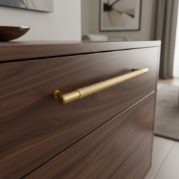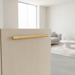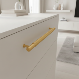 Brúsená zlatá povrchová úprava pôsobí nadčasovo a exkluzívne, vďaka čomu sa úchytka skvele hodí do moderných, glamour aj industriálnych interiérov. Výborne vynikne na tmavom nábytku, prírodnom dreve aj na svetlých lakovaných plochách a dodá priestoru prémiový akcent.