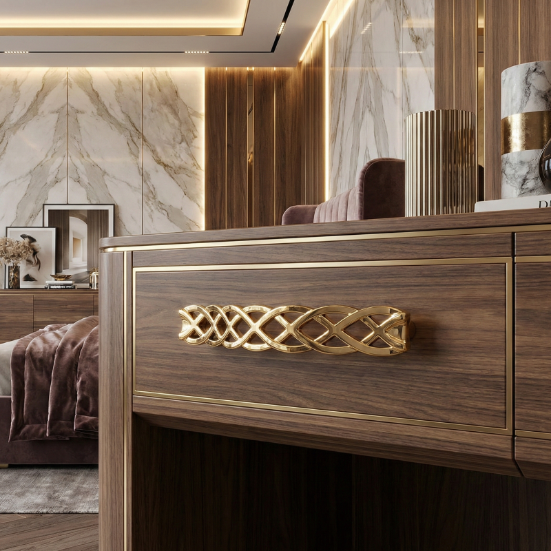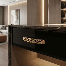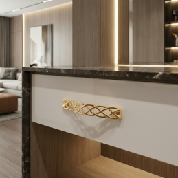 Luxusná nábytková úchytka ALINA v lesklom zlatom prevedení zaujme svojím prepracovaným pleteným dizajnom. Elegantný ornamentálny vzor pôsobí jemne a zároveň výrazne, čím dodá nábytku exkluzívny a dekoratívny charakter.