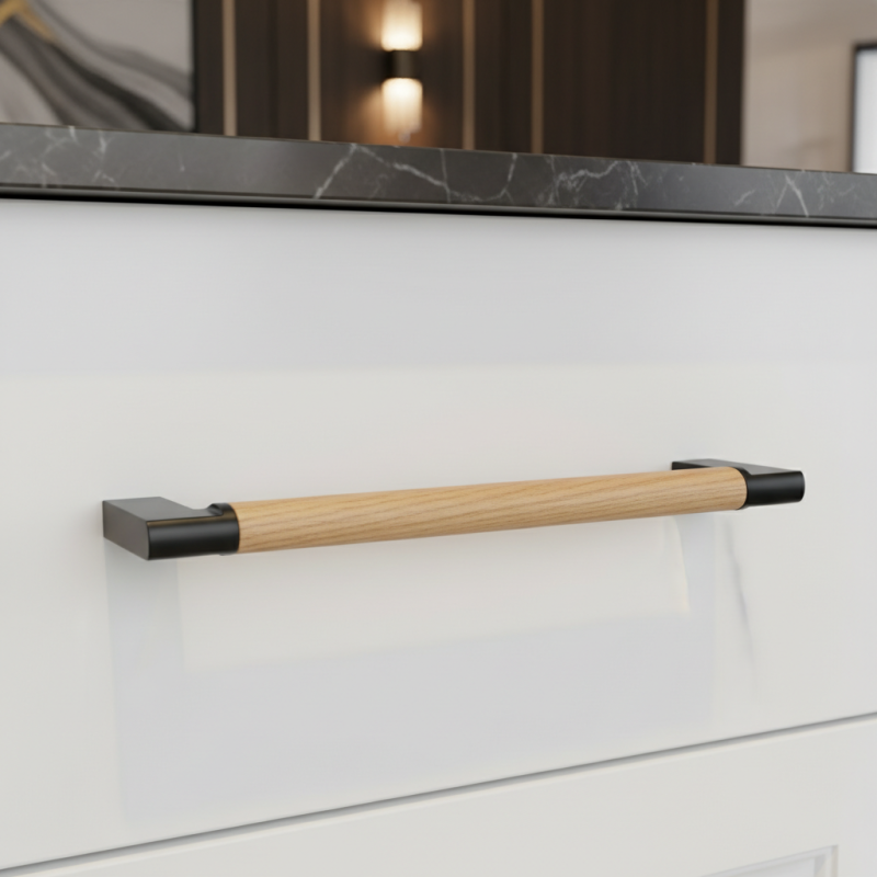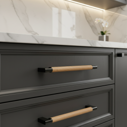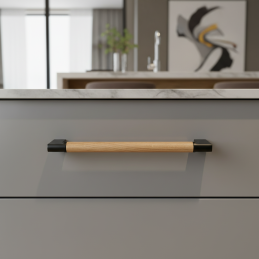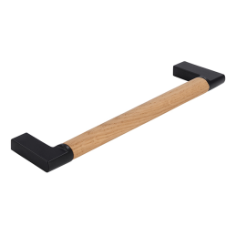 Moderná nábytková úchytka ALICIA spája nadčasovú čiernu povrchovú úpravu s prírodným prvkom lakovaného dubového dreva. Kombinácia kovových úchytov a drevenej časti vytvára harmonický kontrast, ktorý vynikne v moderných, škandinávskych aj industriálnych interiéroch.