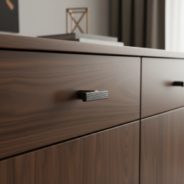 Moderná nábytková úchytka LIZA v elegantnom čiernom matnom prevedení je štýlovým doplnkom pre kuchynské linky, skrinky, komody alebo šatníky. Minimalistický dizajn s jemným drážkovaním na vrchnej časti zabezpečuje nielen moderný vzhľad, ale aj pohodlné uchopenie.