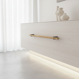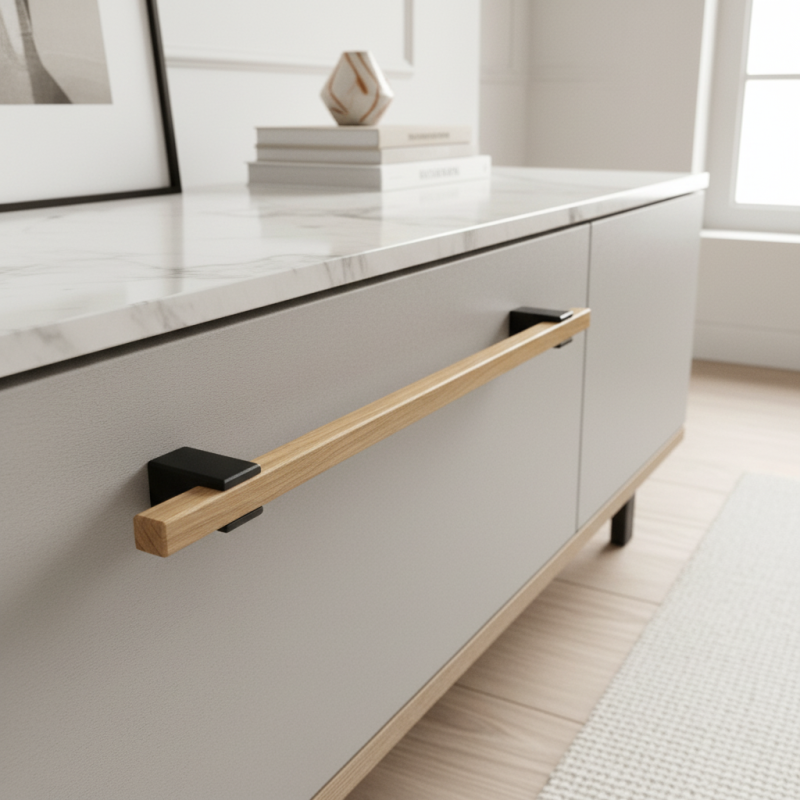 Hranatá dubová časť s krásnou kresbou dreva dodáva nábytku prirodzený akcent, zatiaľ čo čierne drevené držiaky vytvárajú jemný vizuálny kontrast bez použitia kovu. Tento model sa výborne kombinuje s knopkou ALVEA a umožňuje vytvoriť jednotný dizajn v celej miestnosti.