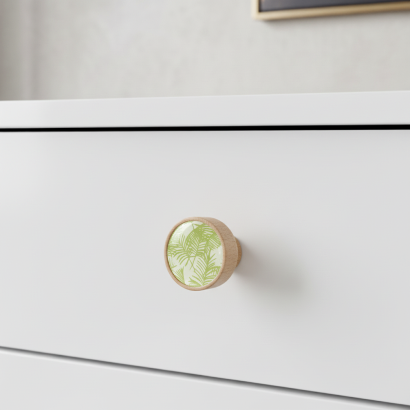 Drevená úchytka ARSIA v prírodnom bukovom prevedení so zeleným listovým motívom prináša do interiéru sviežosť, ľahkosť a prírodný charakter. Vyrobená z masívneho bukového dreva, ktoré je známe svojou pevnosťou a trvácnosťou, doplnená je odolným lakovaným povrchom a dekorom jemných zelených lístkov – ideálnym pre moderné aj prírodne ladené interiéry.