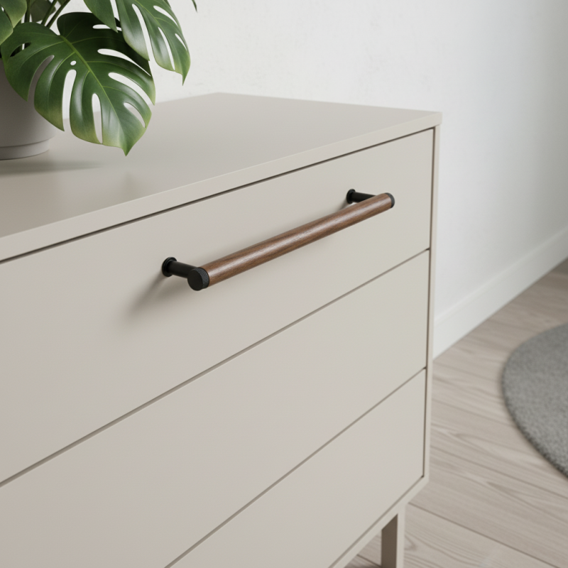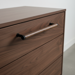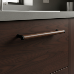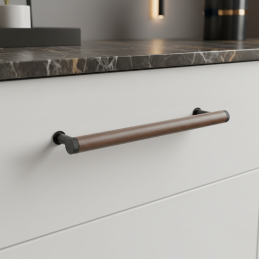 Drevená úchytka SOHO v kombinácii lakovaného orecha a čiernych matných kovových detailov predstavuje moderný industriálny dizajn v tej najčistejšej podobe. Valcové telo z masívneho orechového dreva pôsobí elegantne a luxusne, pričom tmavé kovové koncovky a nožičky dodávajú úchytke charakter a výnimočný kontrast.